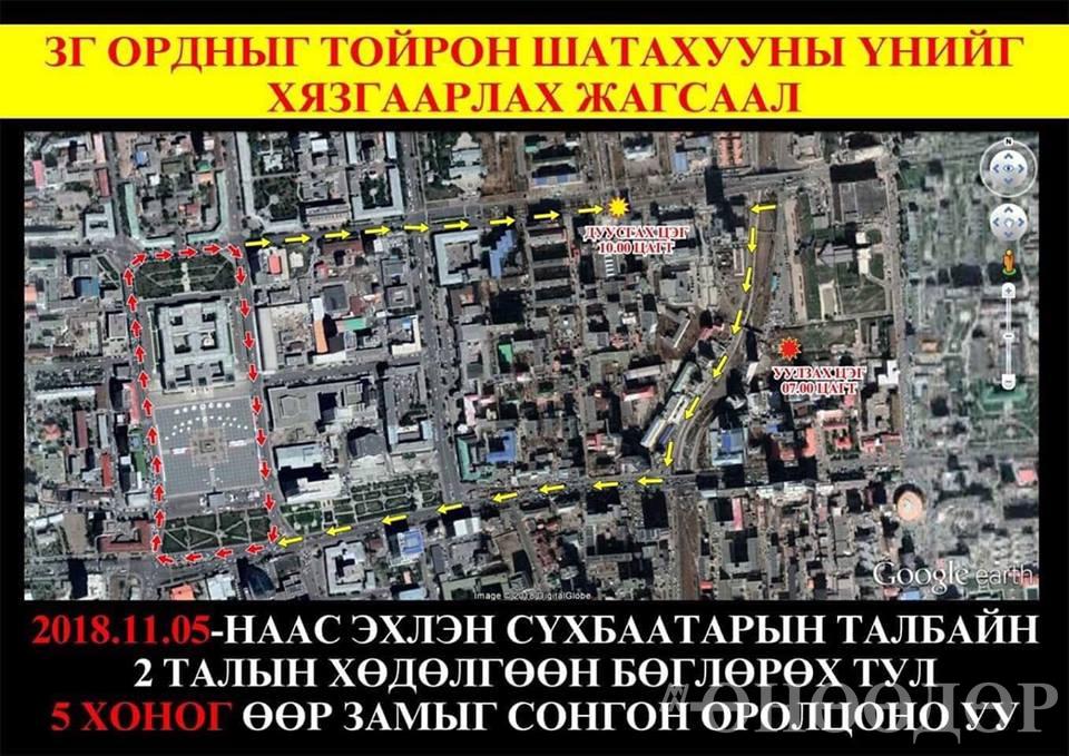 Үүний дагуу тус дүүргийн ЗДТГ-аас хүсэлтийг хүлээн авч, жагсаал цуглаан хийх журмын тухай хуульд заасны дагуу нийгмийн хэв журамд хохирол учруулж эмх замбараагүй байдал бий болгох, төрийн байгууллагад аливаа дарамт шахалт үзүүлэх, дотоод хэрэгт нь хөндлөнгөөс оролцох, хуулиар хориглоогүй зорилгоор анх зохион байгуулагдсан жагсаал цуглааны явцад түүний зорилго өөрчлөгдөж дээр дурдсан агуулга шинжтэй болбол жагсаал цуглааныг цаашид үргэлжлүүлэхийг хориглоно гэдгийг анхааруулсан байна.