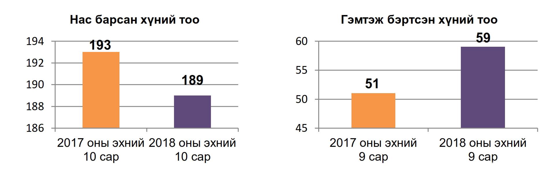 Харин өнгөрсөн оны мөн үетэй харьцуулахад улсын хэмжээнд аюулт үзэгдэл, осолд өртөж нас барсан хүний тоо 4-өөр буурч, гэмтэж бэртсэн хүний тоо 8-аар нэмэгджээ.