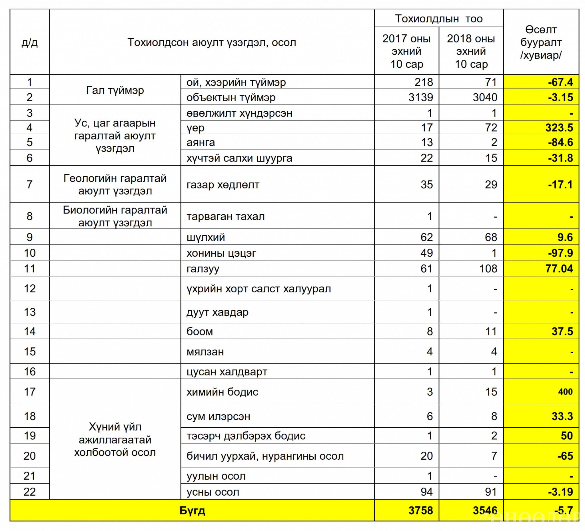 Мөн өнгөрсөн оны мөн үетэй харьцуулахад аюулт үзэгдэл, ослоос аварсан хүний тоо 13-аар буурч, аварсан эд хөрөнгө 16.3 тэрбум төгрөгөөр нэмэгдсэн байна.