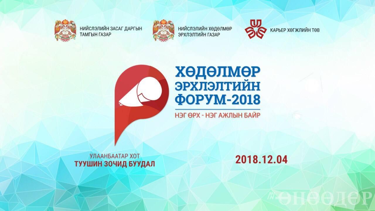 Хөдөлмөр эрхлэлтийг дэмжих үйл ажиллагаанд тулгамдаж буй асуудлуудыг нийгмийн олон талын оролцоонд тулгуурлан шийдвэрлэх боломж, гарц, шийдлийг тодорхойлох, хөдөлмөрийн зах зээлийн идэвхитэй бодлогыг орон нутагт хэрэгжүүлэх, техник технологийн болон менежментийн өөрчлөлт шинэчилэл хийх шаардлага, түүнийг хэрэгжүүлэх арга замын талаар хэлэлцэж, гарсан санал зөвлөмжийг холбогдох газруудад хүргэх зорилготой "Нэг өрх-Нэг ажлын байр" ХӨДӨЛМӨР ЭРХЛЭЛТИЙН ФОРУМ-2018 арга хэмжээг 2018.12.04-ны өдөр Туушин зочид буудлын хурлын танхимд зохион байгуулах гэж байна. Нийслэлийн Хөдөлмөр Эрхлэлтийн Газар санаачлан, НЗДТГ, Карьер хөгжлийн төв хамтран энэхүү форумыг зохион байгуулах бөгөөд "Хөдөлмөр эрхлэлтийн салбарын өнөөгийн байдал, ирээдүйн чиг хандлага, ажиллах хүчний хомсдол уу, менежментийн хомсдол уу, хөдөлмөр зуучлалын үйлчилгээний инноваци, ажлын хандлага нь ур чадвараас илүү, мэргэжил сонголт, хөдөлмөрийн бүтээмжийн уялдаа гэсэн салбар хуралдаанууд хуралдах юм байна.