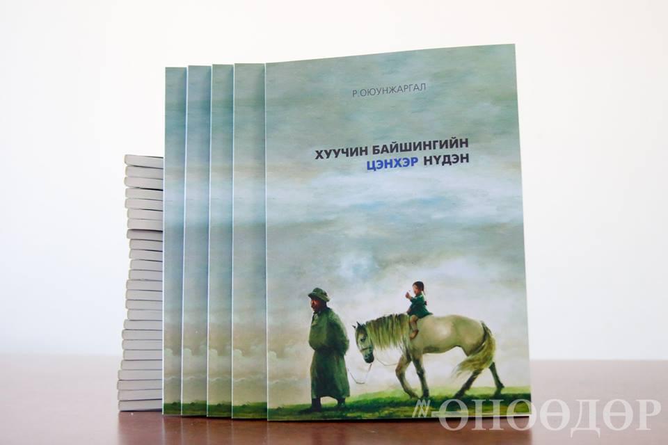 Энэ бол зураач Б.Хонгорзулын “Бидэн гурав” хэмээн нэрийдсэн шинэ бүтээл бөгөөд сэтгүүлч Р.Оюунжаргалын “Хуучин байшингийн цэнхэр нүдэн” номд зориулжээ. Өвөө нь морио услаад, аргамжихаар явж байгааг гэрийнхээ гаднаас харсан ач охин нь гүйхээрээ очиход өвөө нь мордуулаад хөтөлж яваа байдал. Өвөө охиноо эрхлүүлээд сэтгэл тэнэгэр, охин морины нуруунд хэрнээ гэрийнхээ хойморт хүүхэлдэйгээр тоглож суугаа мэт амар амгалан. Гурван настай жаал хотын тавиул. Эмээ, өвөө нь түүнийг эрүүл чийрэг өсгөөд, сургуульд орох болохоор нь хот руу аав, ээж рүү нь илгээнэ. Аль эсвэл охиныг зуны эхэнд хөдөө гаргасан ч байж магад. Аль нь ч бай, айраг, цагаа элбэг дэлгэр зун хүүхдүүдээ хөдөө байлгахыг хүсдэг нь хотожсон монголчуудын араншин. Байгалийн сайхан дахь монгол ахуйд малд ойр, хөгшчүүдийн сургаалаар хүмүүжсэн хүүхэд Монголоо мэддэг, эх орноо хайрладаг хүн болж өснө. Чухам ийм санаагаа сэтгүүлч багадаа хөдөө өсөхдөө ямар ямар ажил хийж, өвөө, эмээдээ тусалж, өөрөө суралцаж, дүүдээ үлгэрлэж байсан тухайгаа дурсан санаж, уран сайхны хэлбэр оруулан бичиж ном болгоход уран бүтээлийн хамтрагч, зураач найз нь хавтасны зураг бүтээж өгсөн нь энэ. “Хуучин байшингийн цэнхэр нүдэн” ном уншигчдын гарт хүрч эхэлжээ.