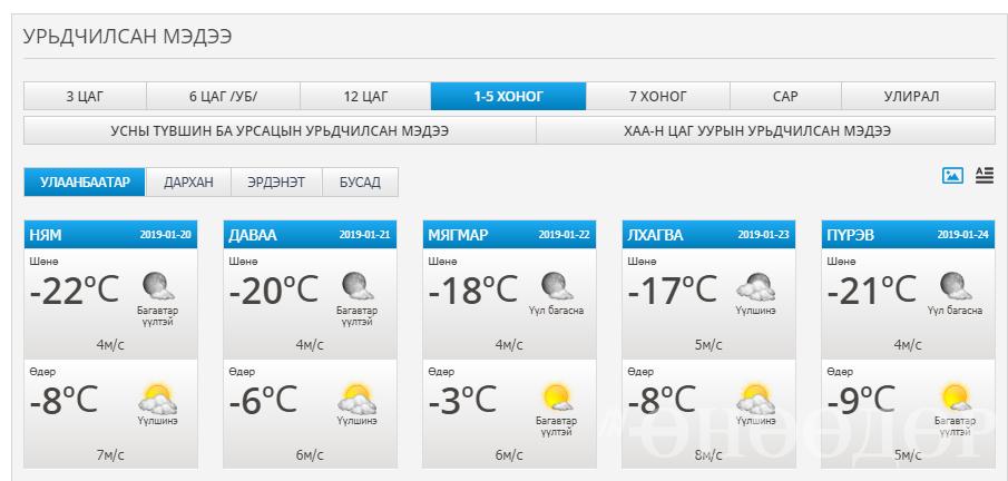 Цаг уурын байгууллагын мэдээлснээр өнөөдөр их төлөв цэлмэг, салхи баруунаас эргэж секундэд 3-8 метрт хүрнэ. Зарим үед секундэд 10-11 метрт хүрч ширүүснэ. Харин Улаанбаатарт өдөртөө -7-10 градус хүйтэн байх гэнэ. Мөн харьцангуй чийгшил 51 орчим хувь, агаарын даралт 880 орчим гектопаскаль байна. Даралт өдөртөө тогтвортой байна.