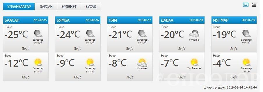 Ирэх Бямба гараг буюу 16-ны өдрөөс эхлэн нийт нутгаар өдөртөө хүйтний эрч сулрах төлөвтэй байна. Хоёрдугаар сарын 18-нд зүүн аймгуудын нутгийн өмнөд болон говийн аймгуудын нутгийн зүүн хэсгээр, 19-нд баруун аймгуудын нутгийн хойд хэсэг, зүүн аймгуудын нутгийн зарим газраар бага зэргийн цас орох төлөвтэй байна. Бусад өдрүүдэд цас орохгүй аж.