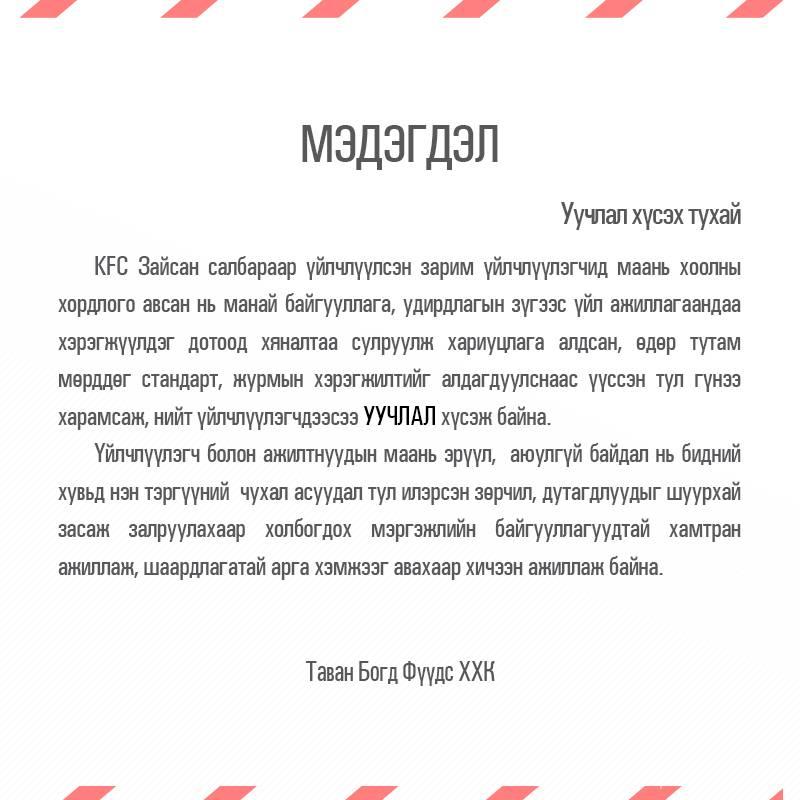 "Таванбогд Фүүдс" ХХК иргэдээс уучлал хүслээ
