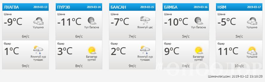 Цаг уур, орчны шинжилгээний газраас гаргасан цаг агаарын тав хоногийн мэдээг хүргэж байна. Улаанбаатар хотод энэ долоо хоногийн эхээр салхитай, сэрүүн байсан бол аажмаар дулаарч, долоо хоногийн сүүлчээр 9-11 градус дулаан байна хэмээн мэдээллээ.