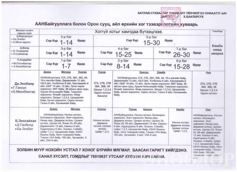 Мөн золбин муур, нохой устгалын ажил сардаа эсвэл улиралдаа хийдэг байсныг халж, долоо хоног бүрийн мягмар, баасан гарагт тус ажлыг гүйцэтгэж байхаар дээрх хуваарьт тусгажээ.