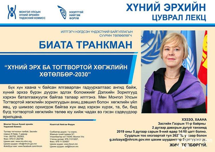 Монгол Улсын Хүний эрхийн Үндэсний Комиссоос Нээлттэй нийгэм форумтай хамтран зохион байгуулдаг Хүний эрхийн цуврал лекцийн 2019 оны эхний дугаар буюу 42 дахь удаагийн лекц болох гэж байна. Энэ удаагийн лекцээр Монгол Улс дахь НҮБ-ын суурин төлөөлөгч, хатагтай Биата Транкман оролцож “Хүний эрх ба Тогтвортой хөгжлийн хөтөлбөр-2030” сэдвээр лекц унших гэнэ.