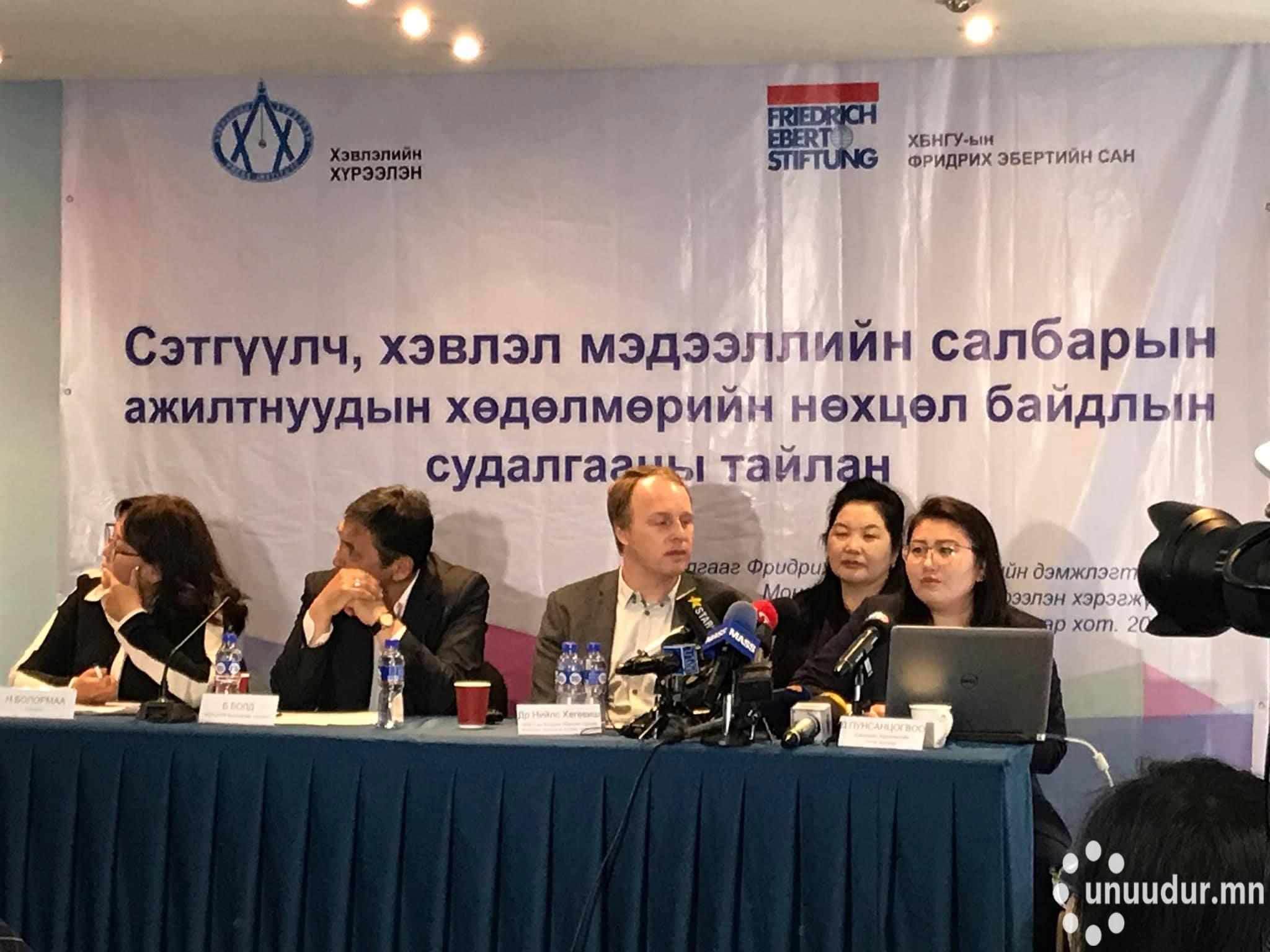 ХБНГУ-ын Фридрих Эбертийн сангийн туслалцаагаар Монголын хэвлэлийн хүрээлэнгээс хэвлэл мэдээллийн салбарт ажиллагсдын аж байдлын судалгаа хийснээ танилцууллаа. Хэвлэл мэдээллийн салбарт ажиллагсдын тал хувийнх нь өрхийн сарын орлого улсын дундаж хэмжээ болох 1.2 сая төгрөгт хүрдэггүй аж. Сэтгүүлчдийн сарын дундаж цалин 664 мянган төгрөг байгаа нь улсын нийт ажилчдын дунджаас 245 мянган төгрөгөөр бага үзүүлэлт юм. Харин сэтгүүлчдийн ажилладаг цаг нь бусад мэргэжлийнхнээс 12 цагаар илүү байгаа юм.