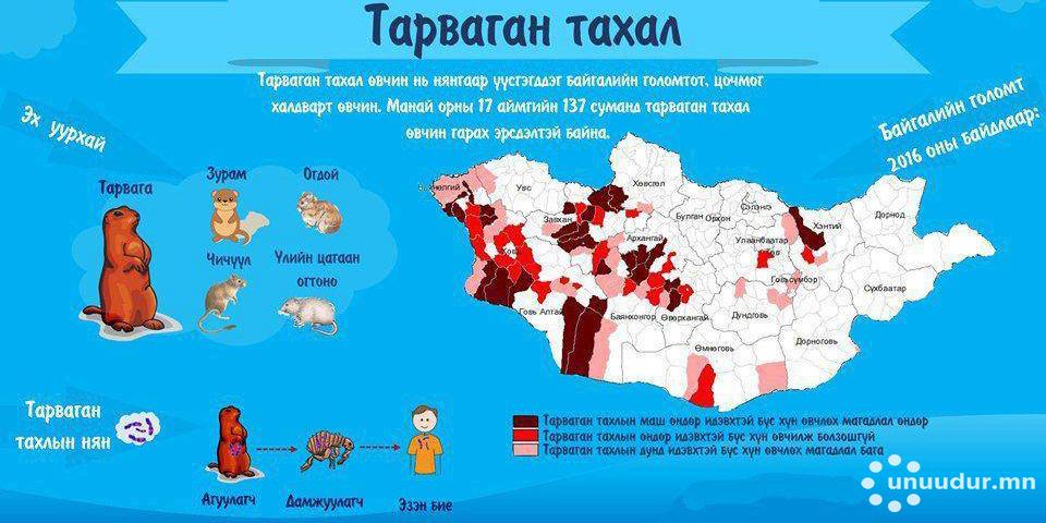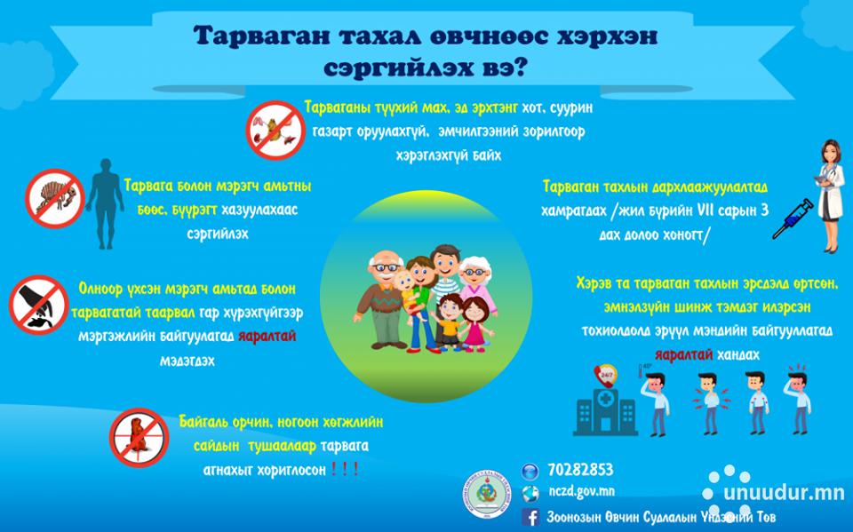Өнгөрөгч дөрөвдүгээр сарын 27-нд Баян-Өлгий аймагт нэг гэр бүлийн хоёр иргэн тарваганы бөөр түүхийгээр нь идсэнээс болж нас барсан харамсалтай үйл явдал болсон. Улмаар тус аймгийн Онцгой комиссоос хорио цээрийн тогтоогоод байгаа билээ. Тарвагатай харьцсан, бөөс бүүрэгт хазуулсан, халуурах, толгой өвдөх, дотор эвгүйрхэх, нүүр нүд улайх, булчин өвдөх зэрэг шинж тэмдэг илэрвэл эмнэлгийн байгууллагад яаралтай мэдэгдэнэ үү хэмээн ЭМЯ-аас мэдээллээ.