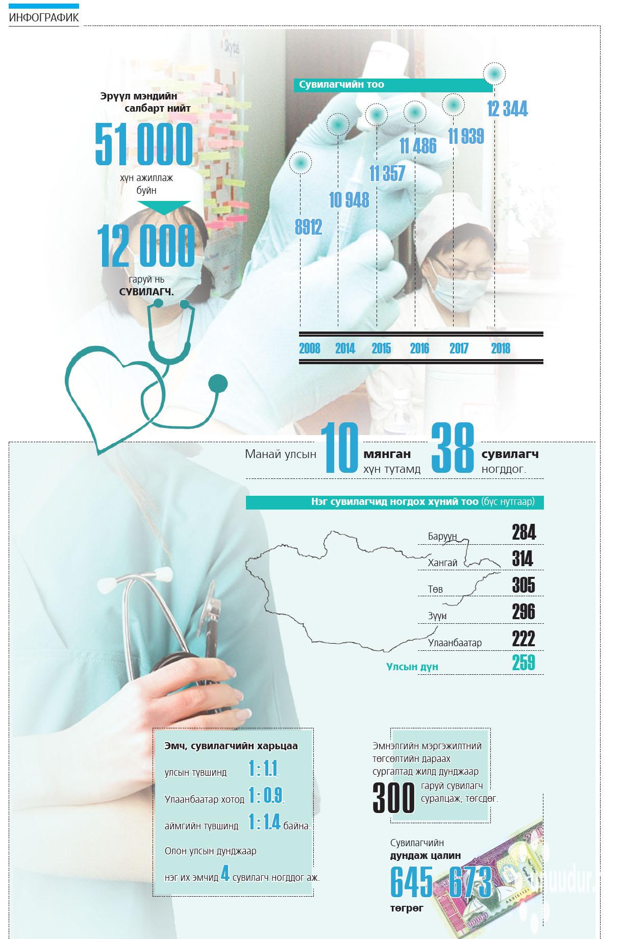 10 гаруй мянган сувилагч мэргэжлээрээ ажиллахгүй байгаа гэсэн судалгааг Эрүүл мэндийн хөгжлийн төвийнхөн өгсөн. Эмнэлгүүдийн ачаалал, эмч, үйлчлүүлэгчийн тооноос шалтгаалж, манайд өдгөө 20 гаруй мянган сувилагч шаардлагатай болжээ. Гэвч эл мэргэжлийг сонгон суралцагчдын тоо улам цөөрч, жилд 700 гаруй хүн төгсөж буй гэнэ. БСШУСЯ, ЭМЯ хамтран эл тоог ядаж 1000-д хүргэх зорилт тавиад байна. Сувилагч нарын нийгмийн асуудлыг шийдвэрлэхгүй, үнэлэмжийг нь өсгөхгүй, цалин хангамжийг нь сайжруулахгүйгээр элсэгч нарын тоог хүчээр өсгөх боломжгүй. Жилд 1000 хүн сувилагчаар төгсөж, мэргэжлээрээ ажиллана гэж үзвэл манай улс 15-20 жилийн дараа л эмч, сувилагчийн харьцаагаа олон улсын стандартад ойртуулж дөнгөнө.
