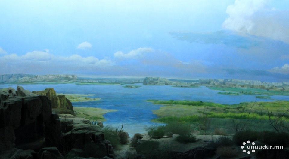 Гаднаа харуул хамгаалалттай, багавтар байшин руу юу байгааг ч мэдэлгүй цувран оров. Гэрэл гэгээ муутай санагдана. Урдхаа тэмтчэн явсаар байгалийн үзэсгэлэнг цогцлоон зассан танхим руу нэвтэрлээ. Уул, ус, хад, чулуу, мод, цэцэг, навч гээд яг л онгон дагшин байгальд зугаалж буй мэт сэтгэгдэл төрүүлэхээр тохижуулсан тус танхимд Шүй Дүнгөүд 40 мянган жилийн өмнө амьдарч байсан хүмүүс болон байгалийн үзэмжийг харуулсан нь тэр аж. Түүнчлэн тэрхүү “байгалийн үзэсгэлэн” дунд байрлах “хаданд” дэлгэц суурилуулж, хүн төрөлхтний үүсэл хөгжлийг харуулсан кино гаргаж байв. Газар хөдлөлтийг биеэр мэдрүүлэн, салхи салхилуулж, бороо хур ч оруулав. Намуун салхи сэвэлзэн, нар тусах мэт “тэнгэр” цэлмэг байснаа гэнэт “цахилгаан цахиж”, “газар хөдлөн”, “бороо орж” эхэлсэн юм. Одоогоос 40 мянган жилийн тэртээ ийм л цаг агаар ээлжилдэг байсан байх гэсэн сэтгэгдэл өөрийн эрхгүй төрж байлаа.