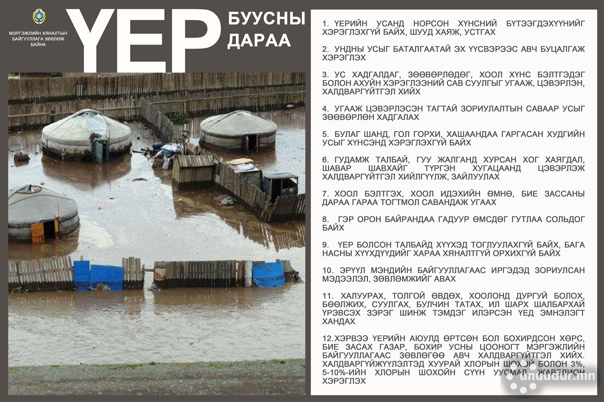 Үер буусны дараа болзошгүй эрсдэл, хордлого, халдвараас урьдчилан сэргийлэхийг МХЕГ-аас сэрэмжлүүлж байна.