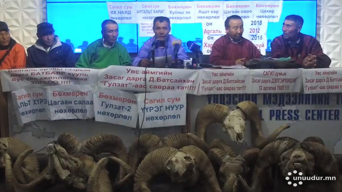 Увс аймгийн Засаг дарга Д.Батсайхан аргал агнах зөвшөөрлийг хууль зөрчин олгосон талаар өнөөдөр "Гулзатын санаачилга" ТББ-аас мэдээлэл хийлээ.