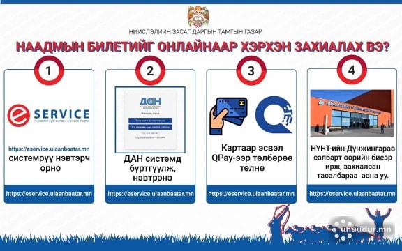 Үндэсний их баяр наадмын нээлт болон бөхийн барилдааны 6,7 дугаар секцийн 1200 ширхэг тасалбарыг өнөөдрөөс буюу 2019 оны долдугаар сарын 08, 09-ний өдрүүдэд 12.00 цагаас эхлэн https://eservice.ulaanbaatar.mn сайтаар онлайнаар худалдана.