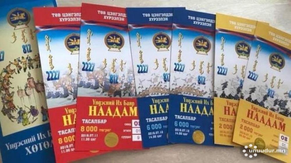 Энэ удаагийн наадмаар ард иргэдэд 6000 тасалбар худалдан борлуулна. Мөн Үндэсний их баяр наадмыг үзэхээр ирж буй жуулчдад 3000 тасалбар худалдана, үлдсэнийг нь Төрийн байгууллагууд, тэдний урилгаар ирсэн гадаадын хүндтэй зочид төлөөлөгчид болон Гадаадын Элчин сайдын яамдууд, Дипломат төлөөлөгчийн газар, олон улсын байгууллагууд төлөөллүүдэд олгоно.