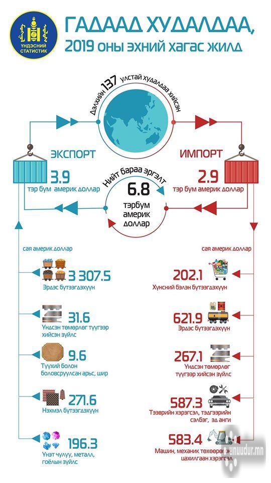 Монгол Улс 2019 оны эхний хагас жилд дэлхийн 137 улстай худалдаа хийж, гадаад худалдааны нийт бараа эргэлт 6.8 тэрбум америк доллар, үүнээс экспорт 3.9 тэрбум америк доллар, импорт 2.9 тэрбум америк долларт хүрлээ. Харин 2019 оны 6 дугаар сард экспорт 675.6 сая америк долларт, импорт 578.7 сая америк долларт хүрч, өмнөх сараас экспорт 75.8 сая америк доллараар буурч, импорт 29.9 сая америк доллараар өссөн байна.