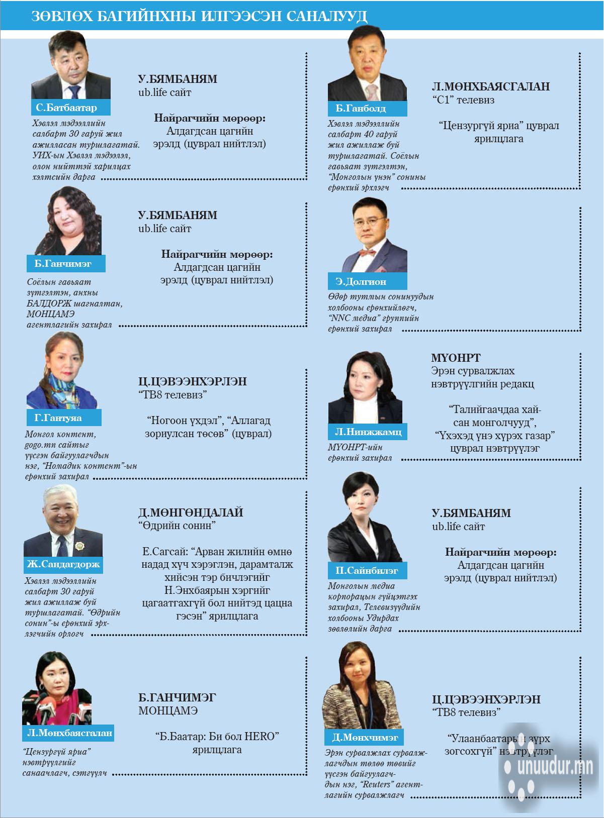 - Жамъян-Очирын Тэгшжаргал - БАЛДОРЖ шагналт, сэтгүүлч нар бүрэлдэхүүнд багтаж байна.
