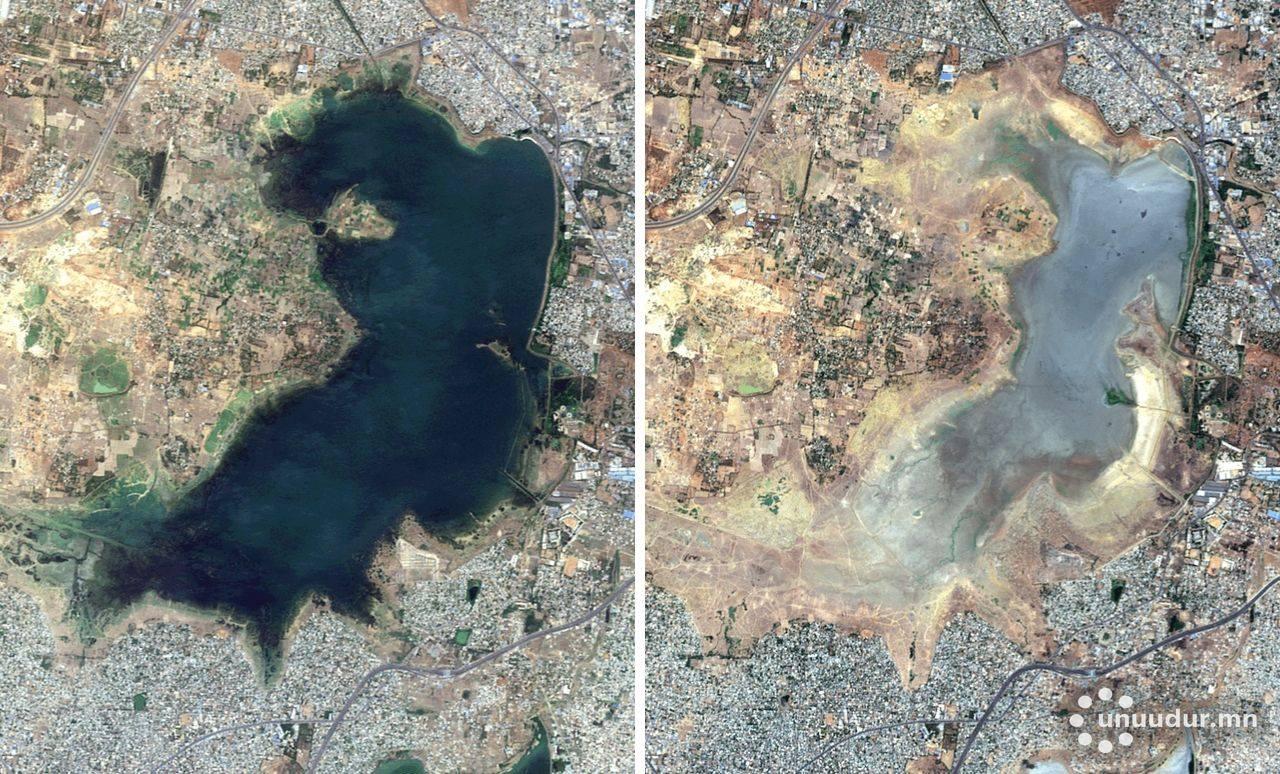 Энэтхэгийн хамгийн том хотуудын нэг болох Ченнайн Пужал нуур усгүй болсныг хиймэл дагуулын зураг харуулж байна. Үүнээс гадна Ченнайн гурван гол, дөрвөн усны эх, таван намаг ширгээд буй аж.