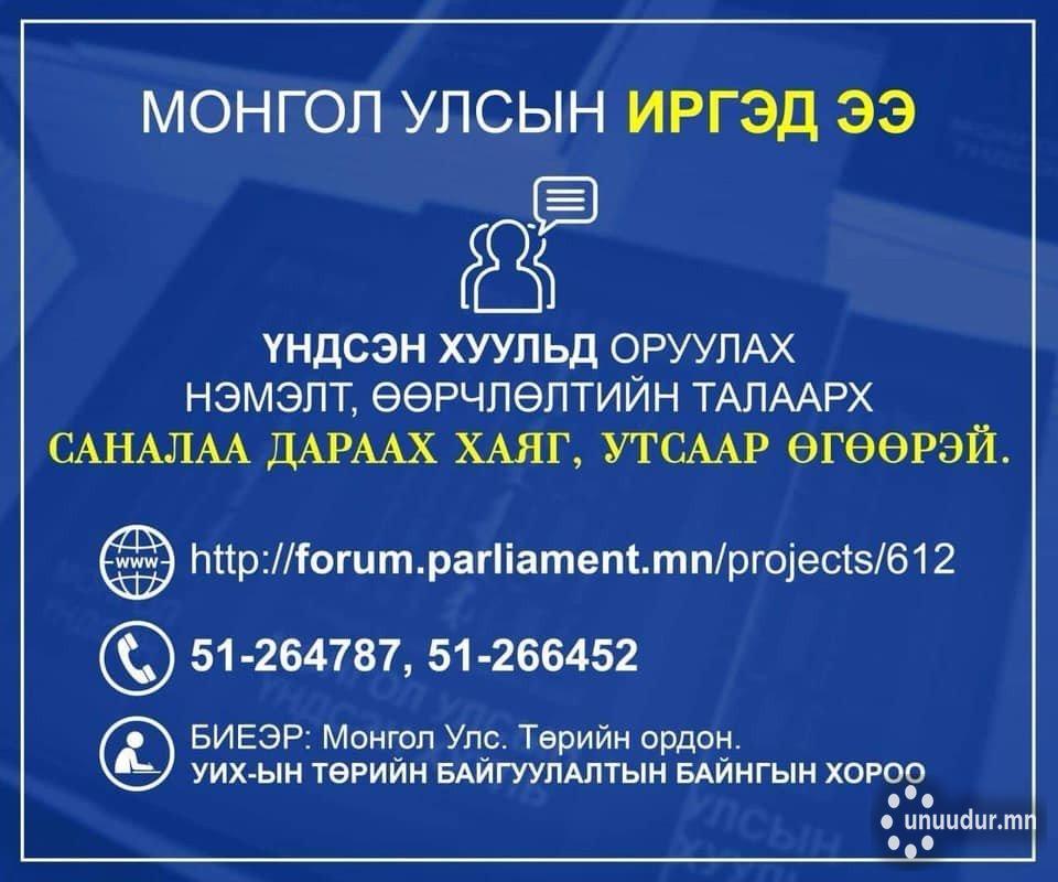 Үндсэн хуульд оруулах нэмэлт, өөрчлөлтийн төслийн хоёр дахь хэлэлцүүлэг наймдугаар сарын 12-нд эхэлнэ. Уг төсөлд оруулах саналыг иргэд олон нийтээс авах ажил үргэлжилж байгаа аж. Саналыг http://forum.parliament.mn/projects/612 хаягаар, эсвэл 51-264787, 51-266452 утсаар холбогдон өгч болох юм байна.