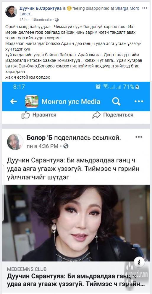 Зууны манлай эстрадын дуучин Б.Сарантуяатай холбоотой “Амьдралдаа нэг ч удаа аяга угааж үзээгүй” гэсэн мэдээлэл саяхнаас олон нийтийн сүлжээнд тарах болсон. Энэхүү мэдээлэл түүнийг үнэхээр бухимдуулсан бололтой. Тэрбээр өөрийнхөө цахим хуудсандаа энэ тухай ийнхүү бичжээ.