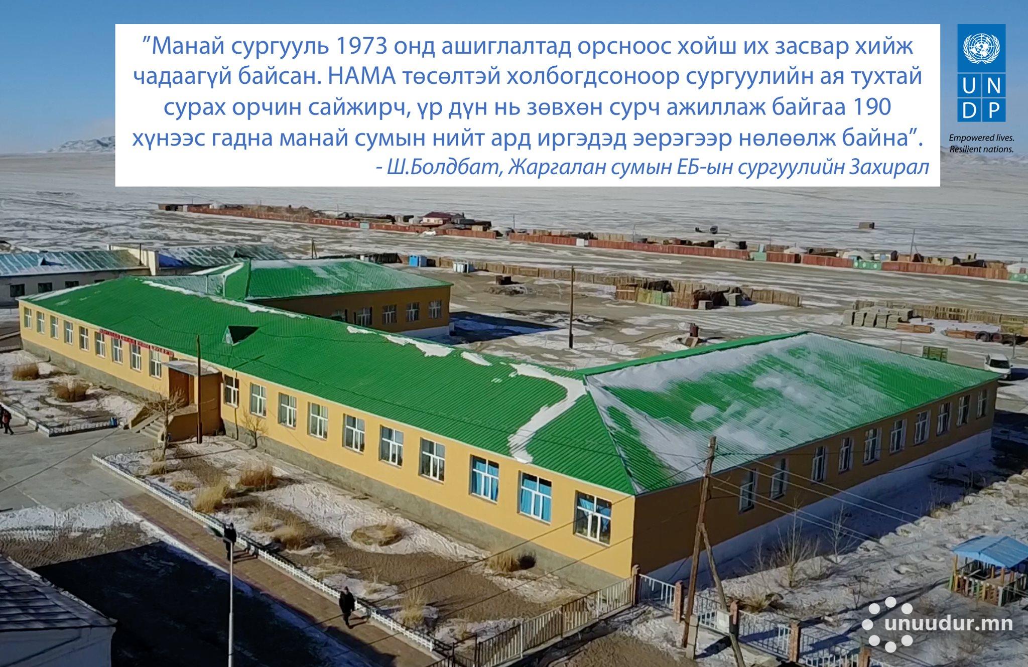 НҮБ-ын Хөгжлийн хөтөлбөрийн НАМА төслийн хүрээнд таван газар эрчим хүчний хэмнэлттэй загвар төсөл хэрэгжүүлж байгаагийн нэг нь Говь-Алтай аймгийн Жаргалан сумын сургуулийн барилгын их засварын ажил байв.