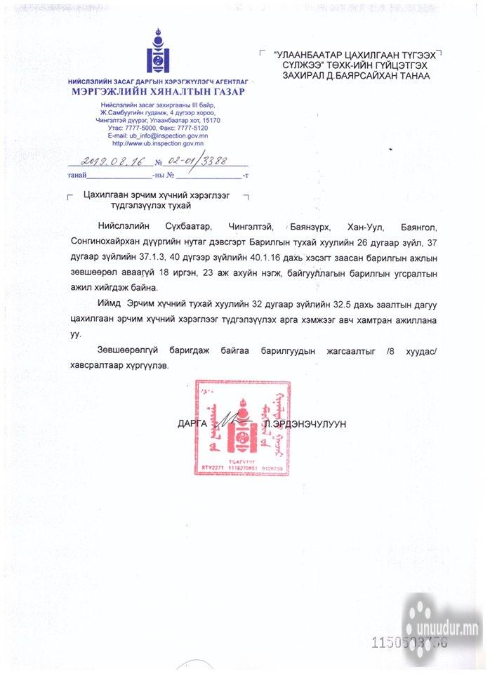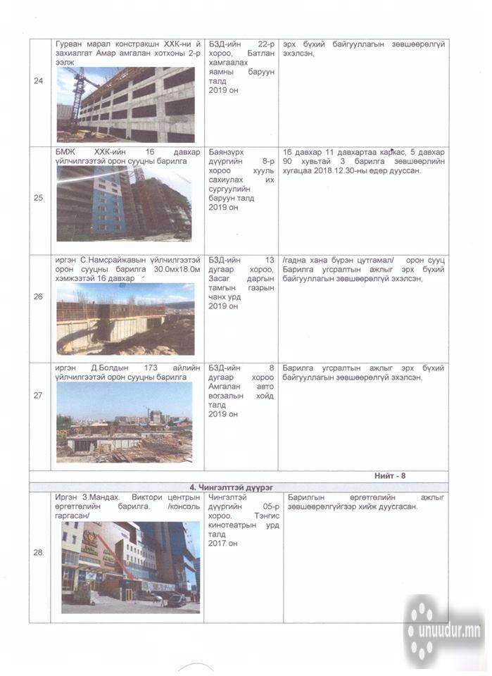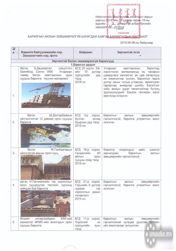 Саяхны хэсэг борооноор Мэргэжлийн хяналтын байгууллагынхан зөвшөөрөлгүй барьсан барилгууд байсныг олж мэдсэн. Харин эдгээр барилгад арга хэмжээ авч эхэлжээ. Ингэхдээ "Улаанбаатар цахилгаан түгээх сүлжээ" ТӨХК-нд хандаад байна. Нийслэлийн нутаг дэвсгэрт баригдаж байгаа зөвшөөрөлгүй 18 иргэн, 23 аж ахуйн нэгжийн цахилгааныг хязгаарлаж өгөхийг хүсчээ.