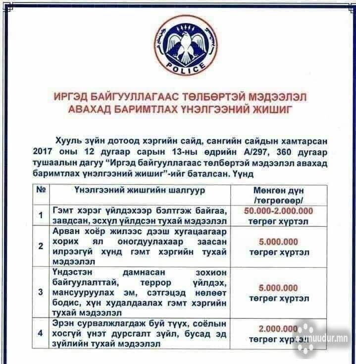 Тээврийн цагдаагийн алба Цагдаагийн албан тухай хууль, Гэмт хэргээс урьдчилан сэргийлэх тухай хуульд зааснаар эзэн холбогдогч нь тодорхойгүй зам тээврийн осол, хэрэг, эрэн сурвалжлагдаж байгаа хүн, тээврийн хэрэгслийн улсын дугаар хууль бусаар үйлдвэрлэж байгаа хүн, албан тушаалтан, аж ахуй нэгж, баримт бичгийн талаарх мэдээллийг иргэд байгууллагаас үнэ төлбөртэй авна. Иргэдээс авсан мэдээлэл үндэслэлтэй болох нь тогтоогдсон тохиолдолд цагдаагийн байгууллага төлбөрийг олгоно. Иргэд та бүхэн Тээврийн цагдаагийн албатай хамтран ажиллахыг уриалж байна.