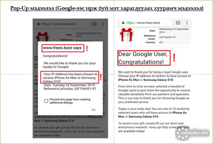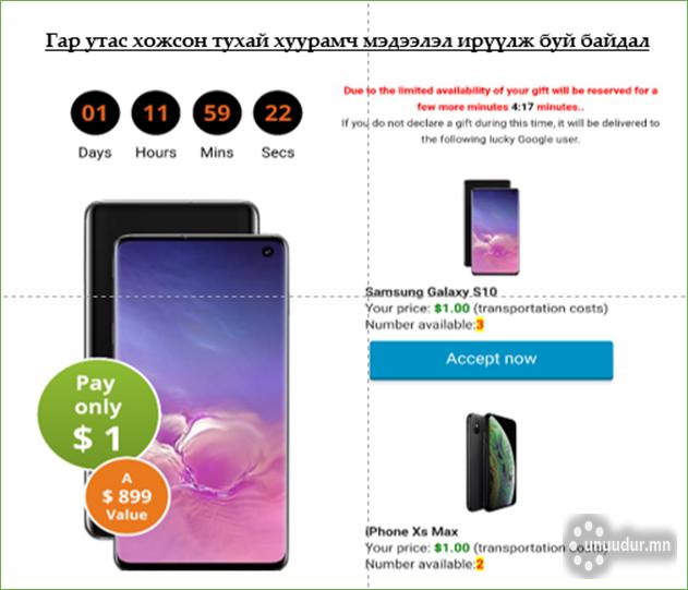 Саяхны нэгэн өдөр танил маань Samsung Galaxy S10 гар утас интернэтээр хожсоноо ихэд сайрхан ярьсан бөгөөд “Google” компаниас түүнийг азтанаар шалгаруулж, ийм сайхан боломж олгосон гэв. Чамлахааргүй өндөр үнэтэй гар утас хожсонд нь би ч битүүхэн атаархаж суулаа. Цахимаар ирдэг хуурамч и-мэйл, pop-up мэдээллийг залилангийн шинжтэй гэж мэддэг хэдий ч энэ удаагийнх хонины арьс нөмөрсөн чоно гэдэг шиг маш үнэмшилтэй байсан төдийгүй цөөхөн үлдсэн боломжийг амжиж шүүрэхгүй л бол харамсаад барахгүй мэт мэдрэмж төрүүлэх аж.