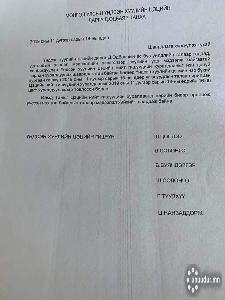 Тэгвэл тэрбээр өнөө өглөө өөрийн саналаар огцрох хүсэлтээ өгсөн талаар бид мэдээлсэн. Саналын дагуу ҮХЦ-ийн гишүүд Д.Одбаярыг огцруулах асуудлаар өнөөдөр 16:00 цагт хуралдахаар товлосон.