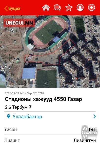 Тэгвэл Төв цэнгэлдэх хүрээлэнгийн хажууд байрлалтай 4551 мк газрыг 2,6 тэрбумаар зарна гэж unegui.mn зарын сайт дээр тавьсан байна. Мөн барилга барих зөвшөөрөл буюу “А” даалгавартай гэдгийг нь тодотгосон байгаа юм.