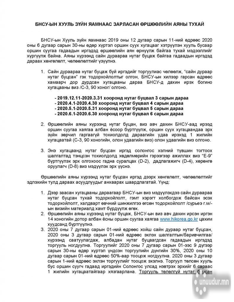 БНСУ-ын Хууль зүйн яамнаас 2019 оны 12 дугаар сарын 11-ний өдрөөс 2020 оны 6 дугаар сарын 30-ны өдөр хүртэл оршин суух хугацааг хэтрүүлэн хууль бусаар оршин суугаа гадаадын иргэдэд өршөөлийн аян өрнүүлж байгаа тухайгаа мэдээллээ. Аяны хүрээнд нутаг буцаж байгаа гадаад иргэнд дараах хөнгөлөлт, чөлөөлөлтийг үзүүлнэ.