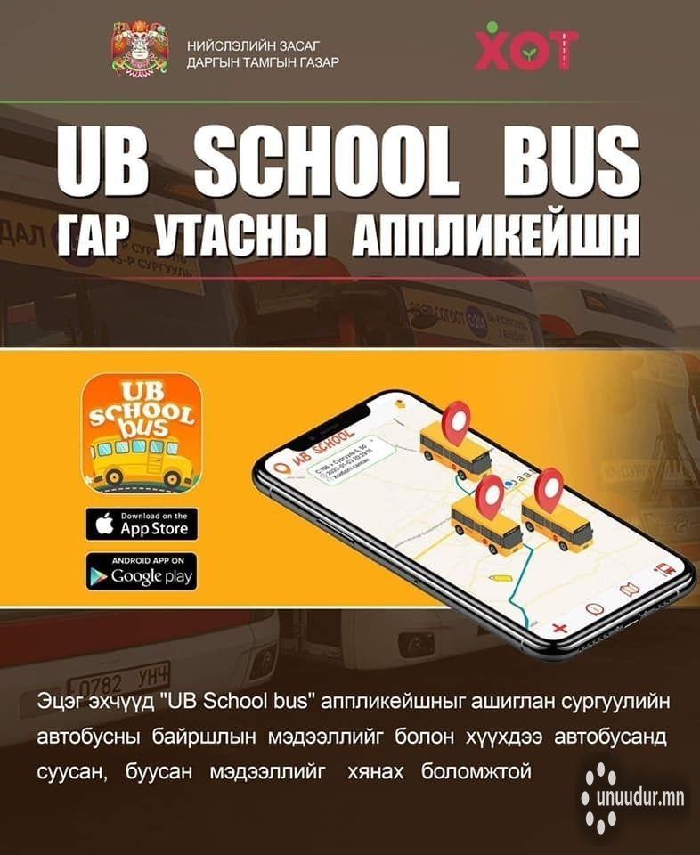 Нийслэлийн Засаг даргын зөвлөлийн хуралдаан өнөөдөр болллоо. Энэ үеэр сургуулийн автобусны “UB school bus” гар утасны аппликейшны талаар танилцууллаа. “UB school bus” ухаалаг гар утасны аппликейшн нь эцэг, эхчүүдэд зориулсан сургуулийн автобусаар зорчиж буй хүүхдийнхээ байршлыг хянах, тогтоох зорилготой аппликейшн юм.