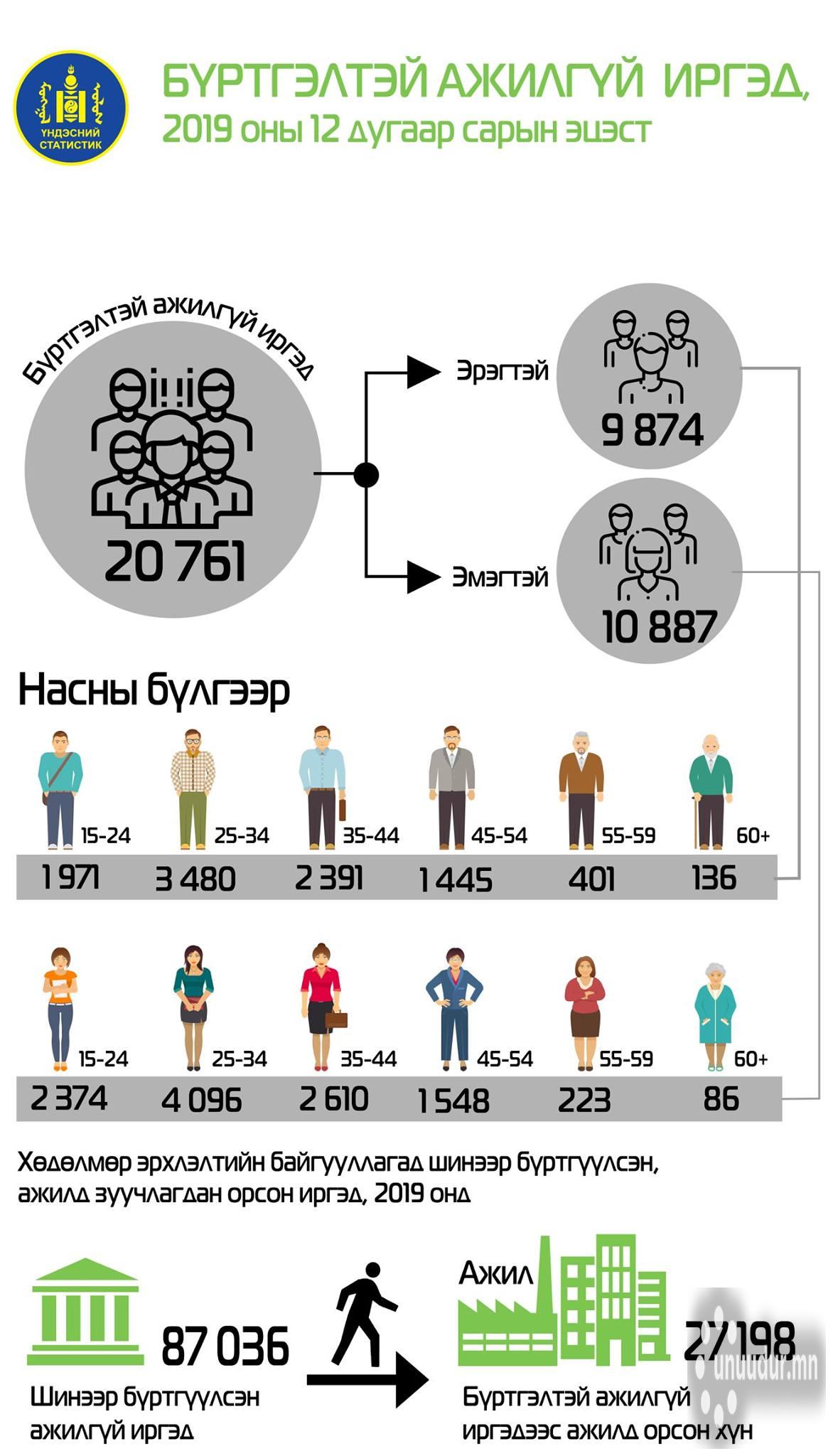 Үүнээс Улаанбаатар хотод 2019 онд нийт 33 473 иргэн нийслэл, дүүргийн хөдөлмөр эрхлэлтийн байгууллагад шинээр бүртгүүлснээс 10 878 иргэн нь ажилд зуучлагдан орсон байна гэж Үндэсний статистикийн хорооноос мэдээллээ.