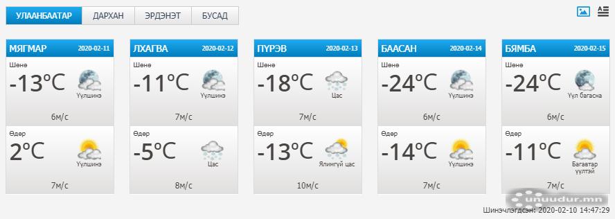 Маргааш нийслэл Улаанбаатар хотод цас ихээр орж, агаарын хэм -5 градус хүртэл буурах төлөвтэй байна. Мөн баруун аймгуудын нутгийн ихэнх, төвийн аймгуудын нутгийн зарим хэсгээр, зүүн аймгуудын нутгийн хойд хэсгээр цас орох юм байна.