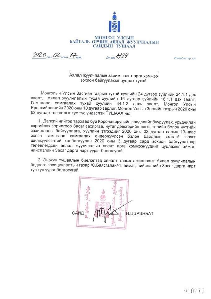 Хөвсгөл аймгийн Онцгой комиссын хуралдаанаар өвлийн аялал жуулчлалыг хөгжүүлэх зорилгоор жил бур уламжлал болгон зохион байгуулдаг Мөсний баярыг шинэ коронавирусийн халдвараас урьдчилан сэргийлэх зорилгоор цуцлах саналыг БОАЖЯ-нд хүргүүлээд байсан юм.
