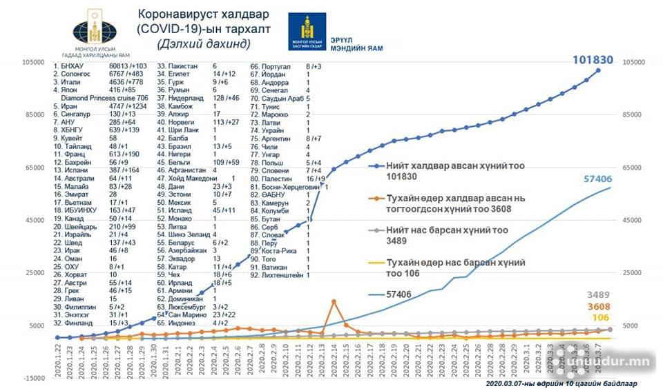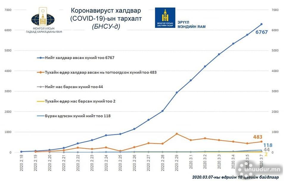 2020 оны гуравдугаар сарын 7-ны өдрийн 10:00 цагийн байдлаар коронавирусийн тархалт ямар түвшинд байгааг Эрүүл мэндийн яамнаас графикаар танилцуулжээ.