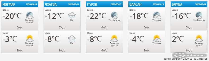 Энэ лхагва гарагт /2020.03.11/ Улаанбаатар хотод цас ихээр орж, агаарын температур -8 градус хүрэх төлөвтэй байна. Мөн төвийн аймгуудын ихэнх нутаг, баруун болон зүүн аймгуудын нутгийн зарим газраар цас орж, цасан шуурга шуурах аж. Харин энэ сарын 12-нд баруун аймгуудын нутгийн зүүн, говийн аймгуудын нутгийн баруун хэсгээр, 13-нд Хөвсгөл, Хэнтэйн уулархаг нутгаар цас орох юм байна.