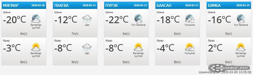 Маргааш Улаанбаатар хотод цас ихээр орж, агаарын температур -8 градус хүрэх төлөвтэй байна. Мөн төвийн аймгуудын ихэнх нутаг, баруун болон зүүн аймгуудын нутгийн зарим газраар цас орж, цасан шуурга шуурах аж. Харин энэ сарын 12-нд баруун аймгуудын нутгийн зүүн, говийн аймгуудын нутгийн баруун хэсгээр, 13-нд Хөвсгөл, Хэнтэйн уулархаг нутгаар цас орох юм байна.