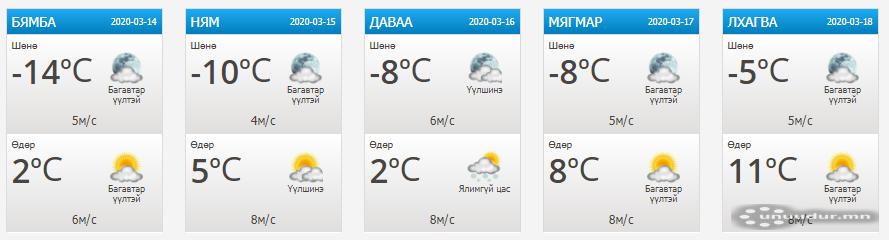 УЦУОШГ-аас мэдээлснээр ойрын хоногуудад ихэнх нутгаар өдөртөө хүйтний эрч эрс суларснаас цас эрчимтэй хайлж, шар усны үер болох нөхцөл бүрдэж байна. Мөн Улаанбаатар хотод лхагва гарагт 11 градус хүртэл дулаарна хэмээн онцолжээ.
