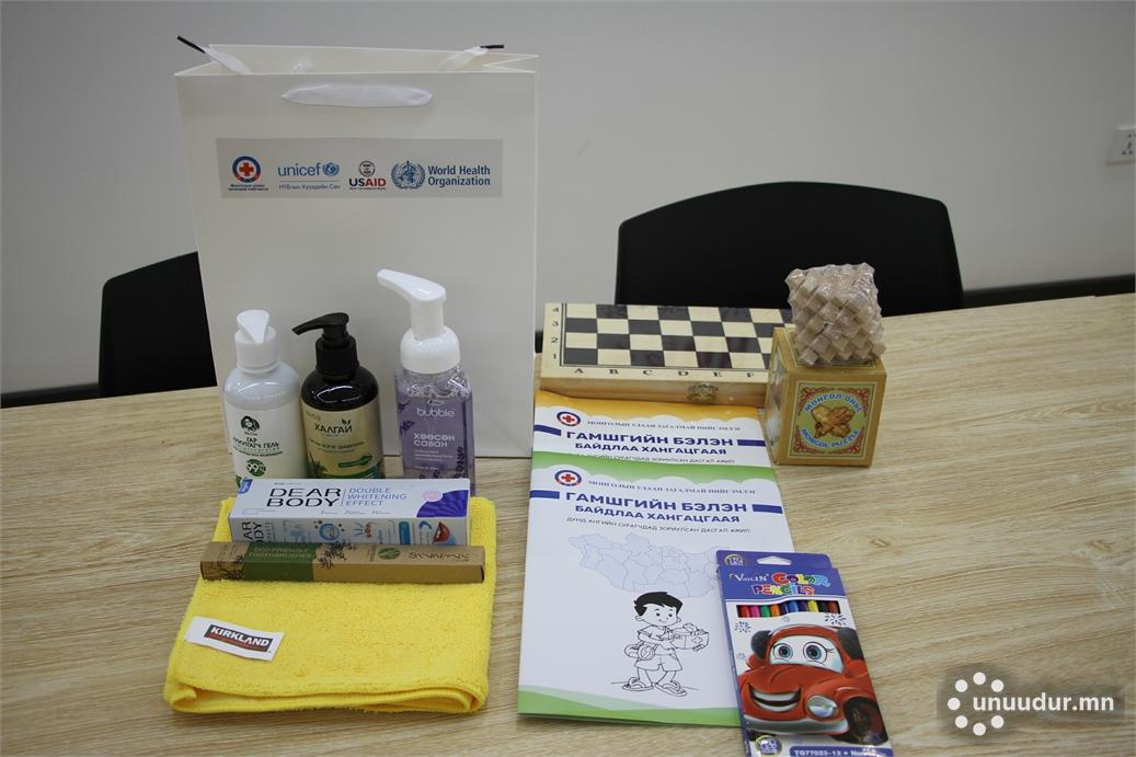 Багцад гарын шингэн саван, гар ариутгагч гель, шампунь, оо, сойз, гар нүүрийн алчуур, бичгийн хэрэгсэл, монгол уламжлалт оньсон тоглоом зэрэг зүйлс багтжээ.
