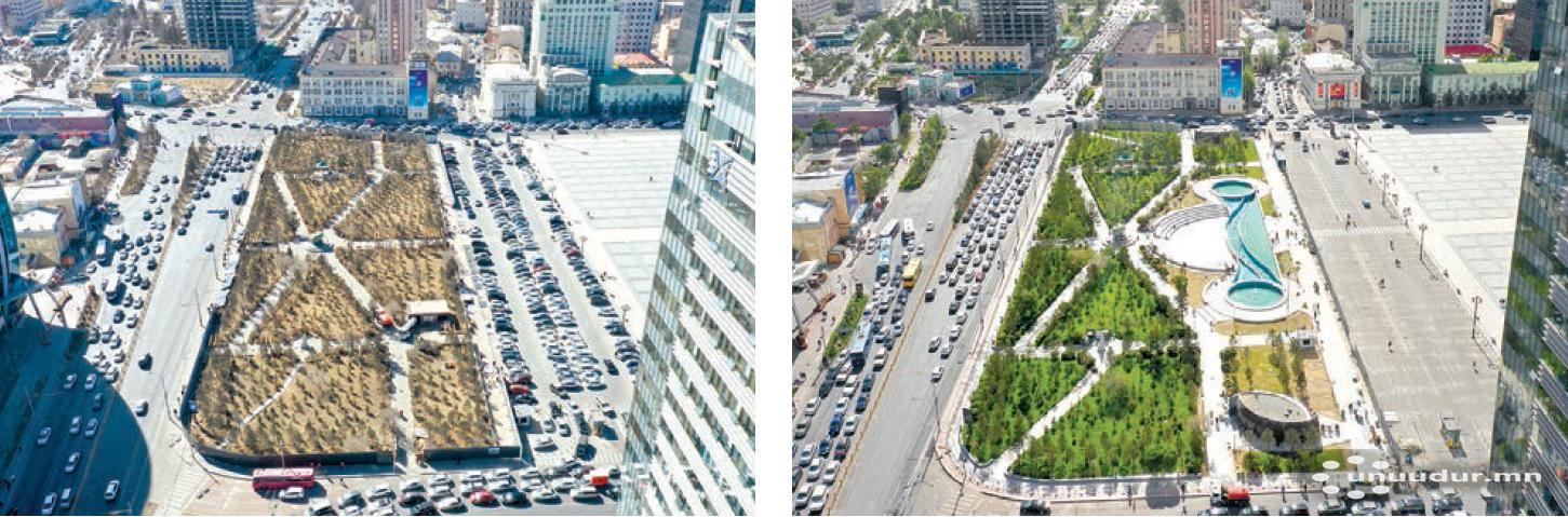 Цэцэрлэгт хүрээлэн хэмээх нэр нь сайхан болохоос биш, булан тохой бүрийг нь орон гэргүй тэнэмэл иргэд эзэгнэсэн, архины шил, хог шороондоо дарагдсан, жорлонгийн өмхий самхай нэвт ханхалсан газарт хүүхдүүд тоглож, хөгшид нарлан тухалж, залуус зугаалах гэж очдоггүй байв. Улсынхаа төв талбайд очно гээд хөдөө гадаанаас зориод ирсэн хүмүүс дэмий л Сүхбаатарын хөшөө хавиар эргэлдэж, арслантай гинжин дээр нь суулаа гэж харуул хамгаалалтынханд хөөгдөн, хаачихаа мэдэхгүй холхидог байсан цаг ердөө саяхных. Тэгвэл өдгөө 84 метр урт таван сан бүхий хөгжимт усан оргилуур, 450 ам метр талбайтай задгай театр, 338 метр урт дугуйн зам, явган хүний боржин чулуун зам, гэрэлтүүлэг, шинээр зүлэгжүүлсэн хөрс, усалгааны системтэйгээ, хашлага сандал, орчин үеийн стандартад нийцсэн нийтийн бие засах газар хоёрыг ч байгуулж, тэр нь дотроо хөгжлийн бэрхшээлтэй иргэдэд үйлчлэх тусгай өрөөтэй болжээ.