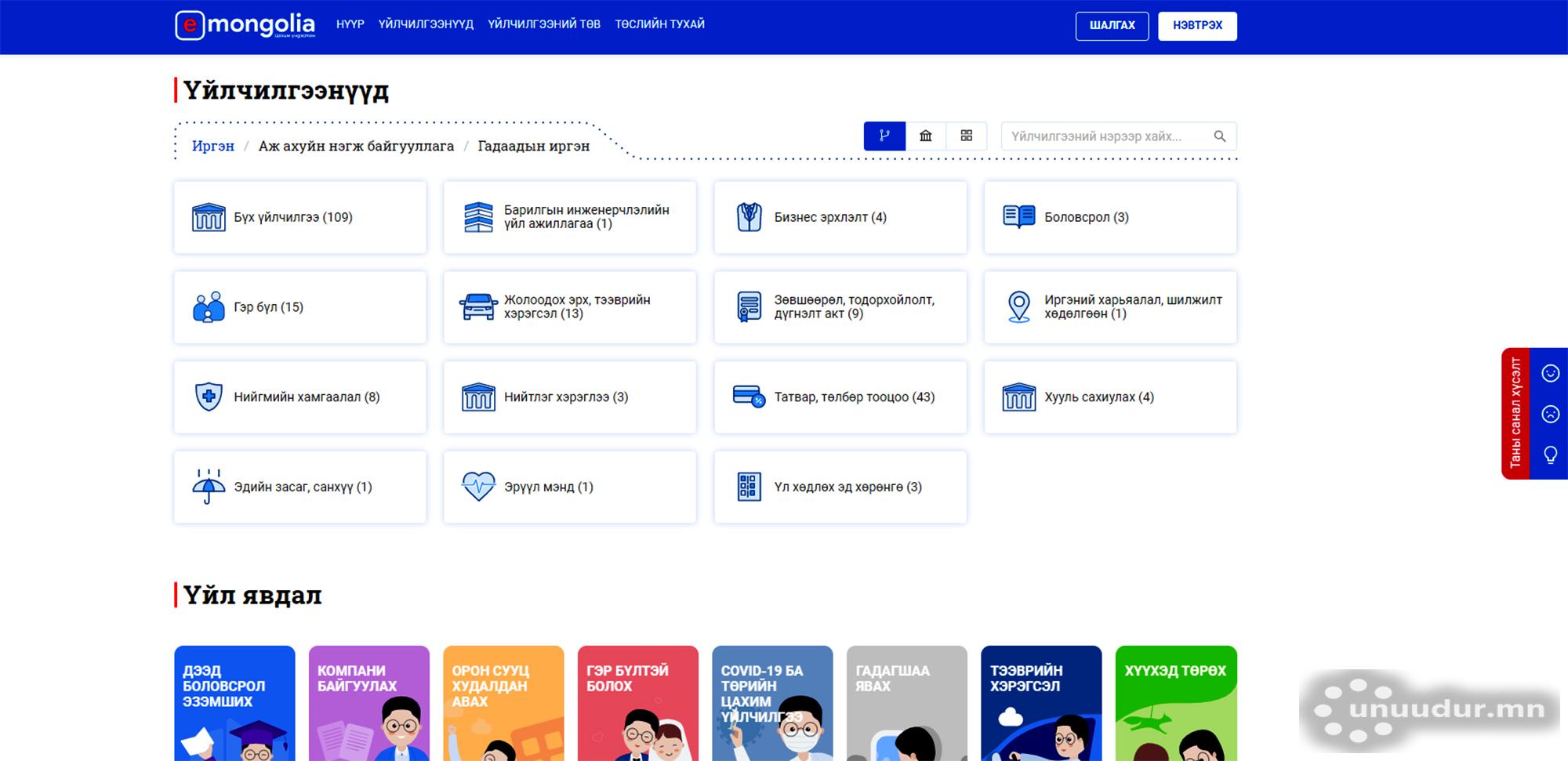 Улсын бүртгэлийн нэгдсэн архиваас олгодог, төрсний болон гэрлэсний зэрэг 26 төрлийн лавлагааг үндэсний цахим үйлчилгээний нэгдсэн систем болох “E-Mongolia”-д шилжүүлсэн талаар өчигдөр мэдээлэв. Өөрөөр хэлбэл, Улсын бүртгэлийн ерөнхий газар (УБЕГ)-аас олгодог 23 төрлийн лавлагаа, гурван төрлийн үйлчилгээг харьяалал харгалзахгүйгээр цахимаар авах боломжтой. Энэ талаар УБЕГ-ын дарга Д.Дэлгэрсайхан “E-Mongolia” нэгдсэн системд иргэд хурууны хээ, регистрийн дугаар зэрэг хэзээ ч давхцахгүй өгөгдлөөр нэвтэрнэ. Үйлчилгээ авсан иргэдийн цөөнгүй нь иргэний үнэмлэхээ дахин захиалсан байна. Саяхнаас уг системээр дамжуулан гадаад паспортыг дахин захиалах боломж бүрдлээ. УБЕГ-ын burtgel.mn сайтын бүх лавлагааг мөн эл системд оруулсан” гэв. Зарим үйлчилгээг ийнхүү цахим хэлбэрт шилжүүлснээр ирэх сарын 1-нээс иргэний лавлагааг Зуун айл дахь Улсын бүртгэлийн нэгдсэн архиваас олгохоо зогсоох аж. Тодруулбал, иргэд шаардлагатай лавлагаагаа www.e-mongolia.mn цахим хуудаснаас авч болох нь. Түүнчлэн ТҮЦ машинаас 10 төрлийн лавлагаа авах боломжтой. Мөн нийслэлийн есөн дүүрэг болон “Дүнжингарав”, “Оргил”, “Мишээл”, “Драгон” худалдааны төв, Баянхошуу, хорооллын “И-март”-д өөрийн биеэр очиж, үйлчлүүлж болно.