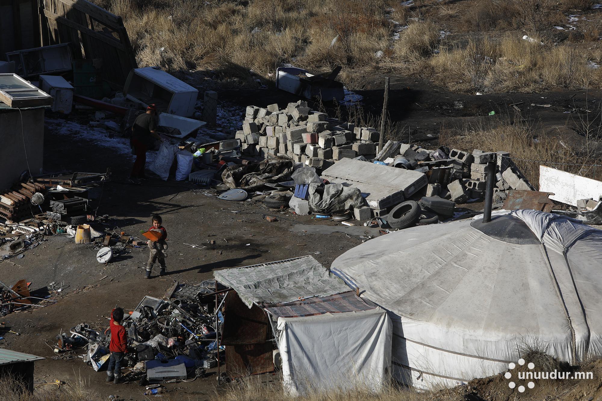Гялгар уут, ундаа, усны хуванцар сав, хувцас хунар, тавилга, цахилгаан хэрэгсэл гээд хүний хэрэглээнээс гарч болох бүхэн байшинг “бүсэлжээ”. Гэрийнхээ үүдэнд байх хуучин муу буйдан дээр тав, зургаа хэрийн насны гурван жаал үсэрч, харайн тоглох аж. Үс нь байдгаараа арзайж, нүүр ам нь энд тэндгүй хөө тортог болж, халтартжээ. Хашаан доторх ч, хүүхдүүдийн байр байдал ч тэр ямар нэг зүйл тэсэрч, дэлбэрсний дараах үеийг санагдуулам. Тэд гаднын хүн ирснийг харсан ч ер тоосонгүй, тоглосон хэвээр. Том хүн бий, эсэхийг лавлан, дуудаж өгөхийг хүүхдүүдээс хүссэний дараа нэгэн бүсгүй гарч ирэв. Түүнтэй цөөн хором ярилцлаа.