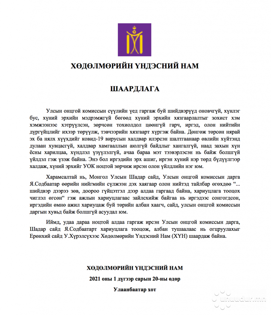 Улсын Онцгой комиссын дарга Я.Содбаатарыг огцруулах шаардлагыг Ерөнхий сайд У.Хүрэлсүхэд хүргүүлнэ хэмээн Хөдөлмөрийн үндэсний намаас мэдэгдлээ. Тус намынхан УОК-ыг цар тахлын үед үргэлж оновчгүй, хүнлэг бус, хүний эрхийн мэдрэмжгүй шийдвэр гаргадаг гэж үзжээ.