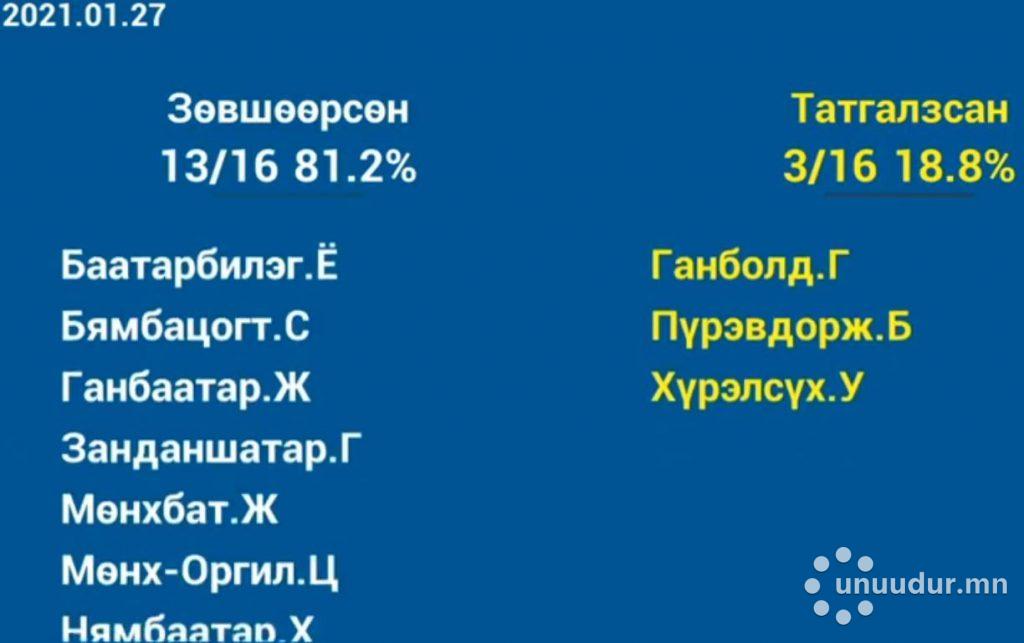 Л.Оюун-Эрдэнийг Ерөнхий сайдаар томилохыг дэмжих санал хураалтад тус байнгын хорооны хуралдаанд оролцсон 16 гишүүнээс 13 нь дэмжив. Харин УИХ-ын гишүүн У.Хүрэлсүх, Б.Пүрэвдорж, Г.Ганболд нарын гурван гишүүн эсрэг санал өгөв.
