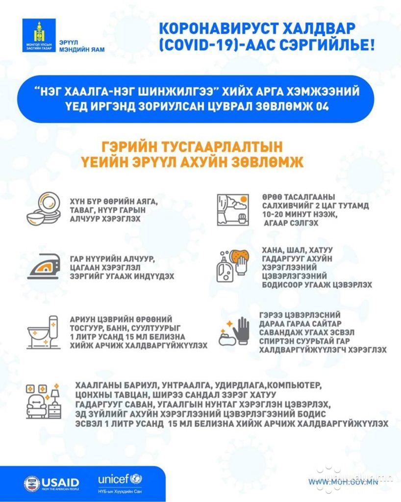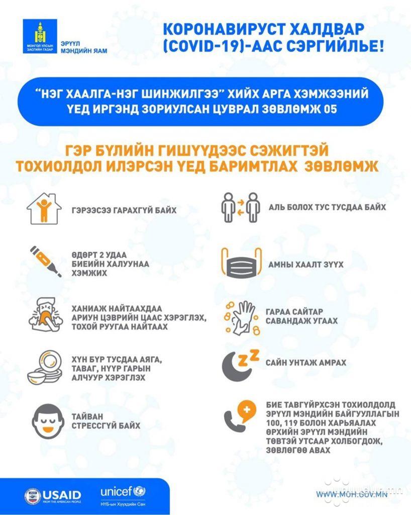 "Нэг хаалга-нэг шинжилгээ" арга хэмжээ зохион байгуулж байгаатай холбогдуулан Эрүүл мэндийн яамнаас дараах зөвлөмжийг гаргажээ. Тодруулбал, гэр бүлийн гишүүдийн дундаас сэжигтэй тохиолдол илэрсэн үед ямар арга хэмжээ авах, гэрийн тусгаарлалтын үед халдвар хамгааллын дэглэмийг хэрхэн сахих зэргийг тодорхой заажээ.
