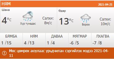 Тодруулбал, энэ сарын 25-нд баруун аймгуудын нутгийн зарим газар, төвийн аймгуудын ихэнх нутаг, зүүн аймгуудын нутгийн баруун, говийн аймгуудын нутгийн зүүн хэсгээр, 26-нд ихэнх нутгаар, 27-нд төв болон говийн аймгуудын нутгийн зүүн хэсэг, зүүн аймуудын нутгийн зарим газраар, 28-нд зүүн аймгуудын нутгийн зүүн хэсгээр бороо, нойтон цас орж, цасан шуурга шуурна. Салхи 25-нд нутгийн зарим газраар секундэд 15-17 метр, 26-нд ихэнх нутгаар, 27-нд нутгийн зүүн хэсгээр секундэд 16-18 метр, зарим үед секундэд 24 метр хүртэл ширүүсэж, шороон шуурга шуурна.