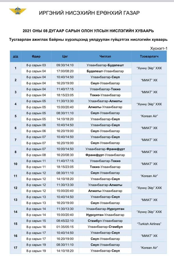 Иргэний нисэхийн ерөнхий газраас 2021 оны наймдугаар сарын нислэгийн хуваарь гаргасныг хүргэж байна.