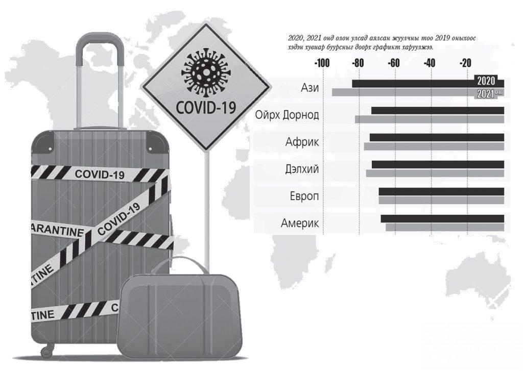 Олон улсын аялал жуулчлал сэргэж, 2019 оны түвшинд хүрэхэд багадаа 3-4 жил шаардлагатай гэсэн тооцооллыг ДАЖБ-ынхан өнгөрсөн жил гаргаж байв. Энэ хугацааг дархлаажуулалт, цар тахалтай дасан зохицох хандлага наашлуулна гэж эергээр зурагласан. Тиймээс судлаач, мэргэжилтнүүд 2021 онд “утаагүй үйлдвэрлэл”-ийн салбар тодорхой хэмжээнд тэнхэрч, өмнөх жилийнхээс дээрдэнэ гэж үзэж байсан юм. Гэтэл энэ тооцоолол талаар болж, олон улсын аялал жуулчлал өнөө жил өмнөх оныхоос ч дорджээ. Америкаас бусад тив өнгөрсөн оныхоос цөөн жуулчин хүлээн авчээ. Тухайлбал, Ази тивд аялсан жуулчны тоо өнгөрсөн онд 80 гаруй хувь (2019 оныхтой харьцуулахад)-иар буурсан бол 2021 онд 90 хувь давснаар хамгийн муу үзүүлэлтийн “эзэн” болов. Үүний дараа Ойрхи Дорнодынх 80, Африкийнх 70, Европын орнуудынх 60 хувиар буурсан үзүүлэлтээр удаах байрт жагссан байна. Эдгээрийг нэгтгэсэн буюу нийт үзүүлэлтээр “утаагүй үйлдвэрлэл”-ийн салбар 2021 онд 75 орчим хувийн алдагдалтай ажилласан нь өнгөрсөн жилийнхээс 2-3 хувиар доошилсон муу үзүүлэлт боллоо.