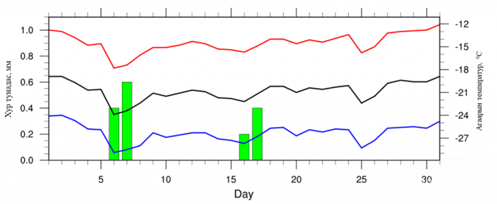 Арав хоног болгоны дунд үеэр ихэнх нутгаар агаарын температур өмнөх үеэсээ 3–5°С–аар хүйтэрнэ. Салхи ихэнх хугацаанд 4–9 м/с, нэг ба хоёрдугаар арав хоногийн дунд үеэр зарим газраар 12–14 м/с хүртэл ширүүсч цасан болон шороон шуурга шуурах төлөвтэй байна.